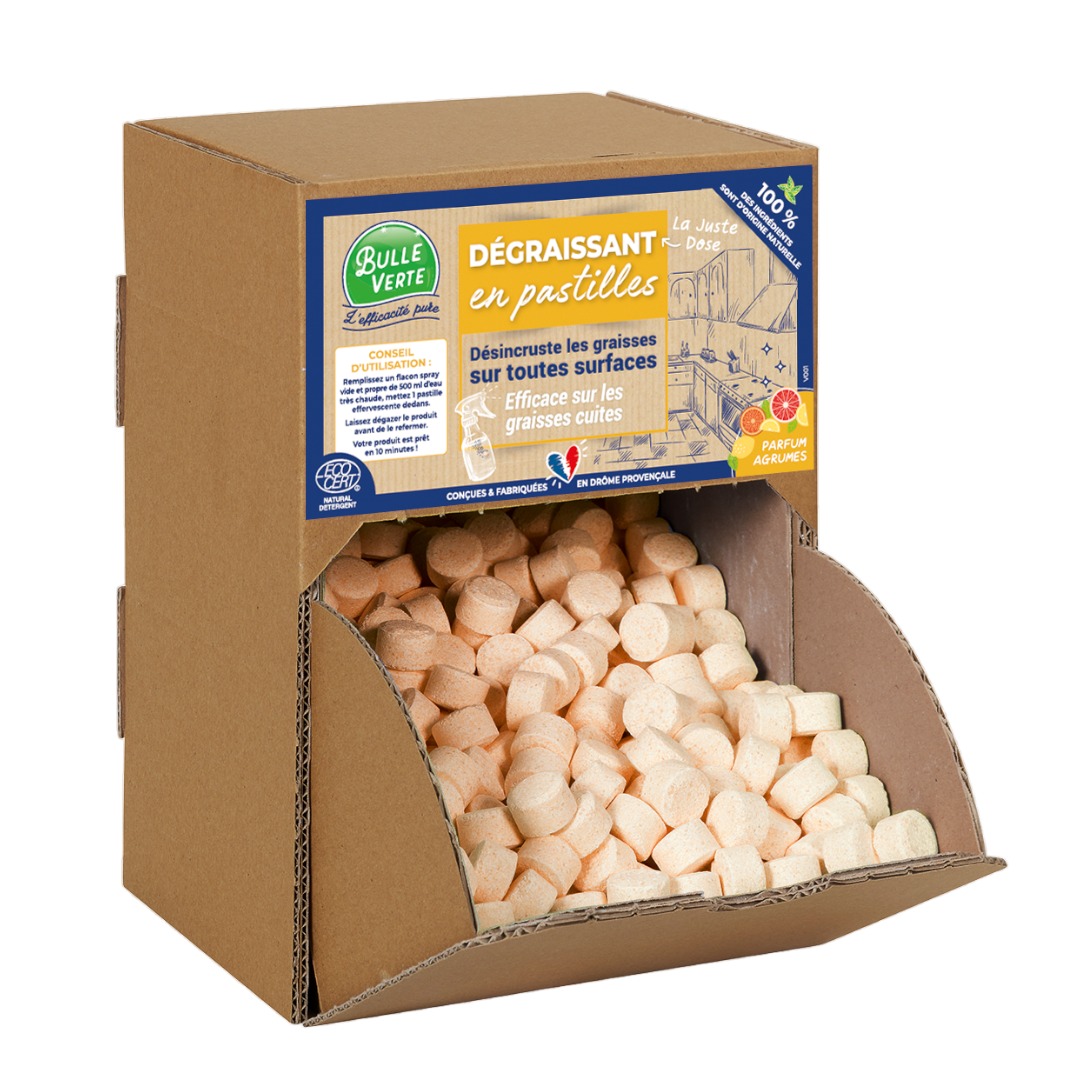 ⚫ Idéal sur tous les supports (plaques de cuisine, inox, etc…) ⚫ Décolle et émulsionne les graisses avec facilité, tout en laissant une douceur sur les surfaces et un confort d’utilisation. ⚫ Parfum agrumes. ⚫ Coloration distinctive orange. ⚫ 1 à 3 pastilles de 5g = 500ml de produit. ⚫ Sans film plastique.